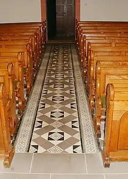 Der Ursprungsbau der heutigen Kirche wurde 1895 im neoromanischen Stil errichtet. Der von dem Architekten Karl Wilde stammende Bauentwurf war 1893 in einem beschränkten Architektenwettbewerb unter den Mitgliedern des Architekten-Vereins zu Berlin als bester unter sechs eingereichten Arbeiten ermittelt worden.[3] Diese Kirche wurde im Zweiten Weltkrieg schwer beschädigt, von ihr sind nur noch die Fundamente, Teile der Außenmauern und des Turms, der Fußboden und der Taufstein erhalten.[2]