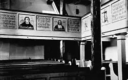 Der mittelalterliche Altar wird von einer Platte mit Weihekreuzen über Schräge bedeckt.[19] Schreiner Fritz Hornig aus Queckborn schuf 1951 nach einem Entwurf des Schweinsberger Architekten Hancke die polygonale Kanzel, die am südlichen Chorpfeiler aufgestellt ist. Sie hat kassettierte Füllungen in den Kanzelfeldern und trägt das Christusmonogramm ☧. Ein 1839/40 von Pastor Venator (Jäger) gestiftetes Kruzifix stand bis 1973 auf dem Altar und seitdem im Gemeindehaus.[21] Seit 1973 steht ein neues Kruzifix auf dem Altar und vor der vermauerten Sakristeitür ein modernes Taufbecken. Das gesamte Gestühl und die Emporen wurden in dem Jahr erneuert und der Haupteingang in den nördlichen Anbau verlegt.[22]