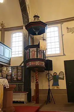 Schmuckstück der Kirche ist die hölzerne polygonale Kanzel aus der Bauzeit der Kirche,[13] die an der östlichen Chorstütze angebracht ist. In ihrer bunten Fassung hebt sie sich von der übrigen Einrichtung wirkungsvoll ab.[5] Im Kanzelkorb sind die rotmarmorierten Füllungen auf weißem Hintergrund oben rundbogig und im unteren Teil querrechteckig gestaltet. Die Kanzelfelder werden durch türkisfarbene Lorbeerstäbe an den Ecken gegliedert. Der profilierte Schalldeckel wird von durchbrochenem Schnitzwerk verziert. Die kegelförmige Spitze wird von Lorbeergirlanden verziert und einem weißen Pelikan bekrönt,[9] der mit Blut aus seiner eigenen Brust seine beiden Jungen nährt, ein altes christliches Symbol für Christus, der sein Leben als Opfer gibt.