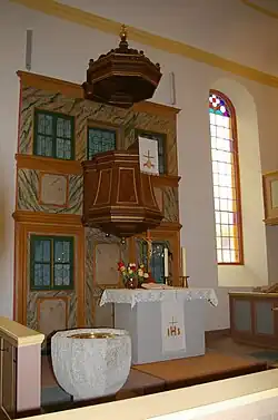 Im Turm führen zweiläufige Treppen zu den dreiseitig umlaufenden Emporen, die auf Pfeilern ruhen. Ältestes Inventarstück ist ein hölzerner Opferstock aus dem Jahr 1687, der aus der Vorgängerkirche übernommen wurde.[17] Die Orgel ist mittig auf der Nordempore aufgestellt. Ihr gegenüber ist die holzsichtige Kanzel vor einer marmoriert angemalten Kanzelwand angebracht.[2] Deren rot-blaue Marmorierung aus der Erbauungszeit der Kirche wurde 1971 freigelegt. Profilierte Gesimse gliedern die Wand, die in den Ecken von quadratischen Fenstern durchbrochen wird, in drei Ebenen. Die polygonale Kanzelkorb verbreitert sich nach unten und wird unten und oben von umlaufenden profilierten Gesimskränzen abgeschlossen. Die Kanzelfelder weisen kassettierte Füllungen auf, die mit Goldfarbe abgesetzt sind. Der achteckige Schalldeckel wird von durchbrochenem Schnitzwerk und geschwungenen Bögen verziert, die in einem vergoldeten Kugelkreuz enden.