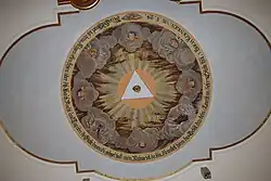 Der Innenraum wird von einer Flachdecke über einer umlaufenden ockergelben Stuckleiste abgeschlossen. Maler Moogk aus Laubach schuf das runde Deckengemälde im Jahr 1773. Es zeigt als Dreieinigkeitssymbol das Auge der Vorsehung, das von einem Dreieck mit Sonne und Strahlenkranz umschlossen wird. Die Strahlen enden in acht Wolken, in denen abwechselnd die vier Evangelistensymbole und vier Engelsköpfe dargestellt sind, die von einem Spruchband mit dem Bibelvers aus 1 Kön 8,29 umschlossen werden.[16]