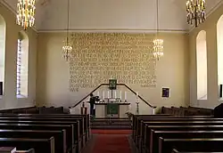 An der Wand hinter dem Kanzelaltar wurde ca. 1950 ein Zitat aus dem 1529 von Martin Luther verfassten kleinen Katechismus angebracht:[2][3]