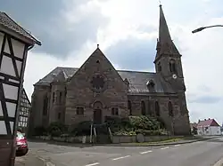 Die neugotische Kreuzkirche wurde 1866–69 nach einem Entwurf von Peter Zindel aus Quadermauerwerk erbaut. Zwischen dem quadratischen Kirchturm im Westen und dem ausladenden Querschiff befindet sich das Langhaus, an das sich der rechteckige Chor anschließt. Die Wände des Langhauses und des Chors werden von Strebepfeilern gestützt. In den Ecken zwischen Chor und Querschiff stehen Treppentürme. Das oberste Geschoss des Turms hat Biforien als Klangarkaden, hinter denen sich der Glockenstuhl befindet, in dem drei Kirchenglocken hängen. Am spitzen, steinernen Helm des Turms befinden sich Dachgauben.