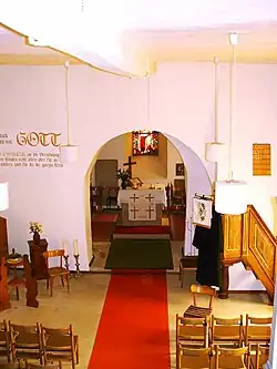 An Ausstattung aus dem 18. Jahrhundert sind eine Kanzel mit Rokokoschnitzerei und überstrichenen Evangelistenbildern, eine dreiflügelige Westempore und Grabsteine des Pfarrers Johann Sebastian Kremer (gest. 1711) und seiner beiden Töchter erhalten.[3] Im Kircheninnenraum befinden sich weiterhin Glasfenster – u. a. ein streng blickender Martin Luther.[4]