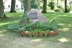 Auf dem Kirchengelände – jetzt abgetrennt von dem auch für polnische Begräbnisse genutzten Gemeindefriedhof – befindet sich ein großer Granitstein mit einer bronzenen Gedenktafel. Sie wurde 2013 aufgestellt und trägt die Inschrift In memoriam Pastor Hans Mohn. Mohn war von 1978 bis 1989 Pastor auf Sylt, von wo aus er sich 1986 nachdrücklich für eine Partnerschaft mit dem einstigen Sorquitten einsetzte. Diese Partnerschaft besteht bis heute und wird sehr aktiv mit der Evangelisch-lutherischen Kirchengemeinde Norddörfer/Sylt wahrgenommen.