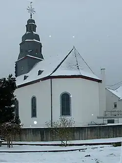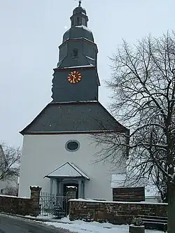 Das 1744 erbaute Kirchenschiff der Saalkirche ist ein geosteter Bruchsteinbau,[1] 14,70 m lang, 8,20 m breit und 5,25 m hoch. Er besitzt einen mehrgeschossigen verschieferten Dachreiter mit kleiner Vorhalle.[4] Von der Architektur her ist sie mit den Kirchen der Nachbardörfer vergleichbar.[3] Die tonnengewölbte Holzdecke im Inneren und die Emporenbrüstung ist im Stil des Hunsrücker Bauernbarocks bemalt, der – für eine evangelische Kirche ungewöhnlich – Anklänge an den Bayrische und Tiroler Stilelemente zeigt.[2]