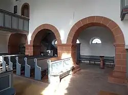 Das Seitenschiff wird durch ein schmales Spitzbogenfenster in der Westwand und drei Lünettenfenster in der Nordwand belichtet. Das mittlere dieser Fenster ist unmittelbar über dem rechteckigen Nordportal eingelassen. Das Seitenschiff wird im Inneren durch eine Arkade aus drei großen Rundbögen mit dem Schiff verbunden. Die Bögen ruhen auf viereckigen Pfeilern mit attischen Basen und enden in auskragenden Kämpferplatten mit Kehle und Wulst.[19] Der Chorbereich ist gegenüber dem Schiff um drei Stufen erhöht. An der Nordwand ermöglicht ein rundbogiges Portal mit einer eisenbeschlagenen Eichentür den Zugang zur Turmhalle.