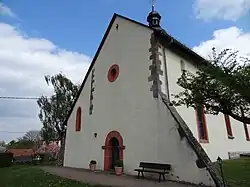 Die Südseite des Schiffs hat drei schmale, hohe Rundbogenfenster, die Ostseite ein hohes Rundbogenfenster und der westliche Giebel ein kleines rundes Bleiglasfenster. An der westlichen Nord- und Südseite des alten Schiffs sind unterhalb der Traufe je drei schlitzartige, rundbogige Obergadenfenster erhalten.[19] Die Kirche wird durch zwei rechteckige Nordportale mit Lünettenfenstern und ein kleines, rundbogiges Westportal mit auskragenden Kämpfern und innen einem geraden Sturz erschlossen. Ein Portal in der Südwand in der Nähe der Kanzel ist zugemauert. Das komplexe Mauerwerk der Südseite weist durch verschiedene Mauerstrukturen und vier Mörtelsorten (hell graugelb, grau, gelbbraun, braunrot) auf verschiedene vier Bauabschnitte hin.[6] Zwei Strebepfeiler an der Nordwest- und an der Südwestecke, die wahrscheinlich im 19. Jahrhundert errichtet wurden, stützen die Mauern ab. Das Satteldach hat eine Höhe von 4,25 Meter und ist über das nördliche Seitenschiff abgeschleppt.[20] Durch das Schleppdach sind die nördlichen Obergadenfenster nur noch von Innen erkennbar, während das frühere Pultdach unterhalb der Fenster an die Nordwand des Schiffs anschloss. Dies wird durch die Eckquaderung im Mittelschiff bestätigt, die 4 Meter über dem Boden enden.[6]