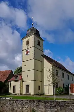 Die Saalkirche wurde 1602 erbaut. Sie besteht aus einem Langhaus, das mit einem Satteldach bedeckt ist, und einem Chorturm im Osten, der 1780 mit zwei mit Ecksteinen versehenen Geschossen auf fünf aufgestockt und mit einer schiefergedeckten Glockenhaube bedeckt wurde. Das vierte Geschoss beherbergt die Turmuhr, das fünfte den Glockenstuhl.