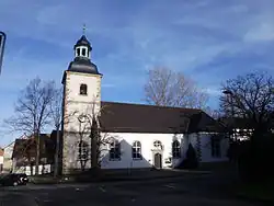 Die verputzte Saalkirche aus der Mitte des 18. Jahrhunderts wurde 1912 mit einem niedrigen Querschiff zur Kreuzkirche erweitert. Der Innenraum ist mit einem hölzernen Gewölbe mit Gewölberippen aus Stuck überspannt.