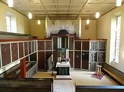 Das Taufbecken, eine Zinnschale mit einem dreibeinigen Holzständer, und der hölzerne Blockaltar sind beweglich. Auf dem Altar steht ein hölzernes Kruzifix des Dreinageltypus. Das hölzerne Kirchengestühl lässt einen Mittelgang frei. Nördlich des Altars sind zwei Bänke quergestellt.