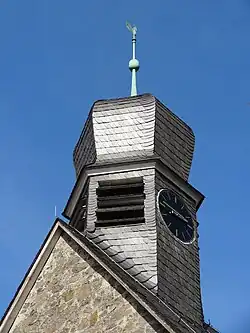 Dem steilen, verschieferten Satteldach ist im Westen ein zweistufiger Dachreiter aufgesetzt. Die sechsseitige Glockenstube hat rechteckige Schalllöcher und das Ziffernblatt der Turmuhr. In barocken Formen ist die Haube gestaltet, die sich nach oben verbreitert und von Knauf, schmiedeeisernem Kreuz und Wetterhahn bekrönt wird. Dem Satteldach sind an beiden Seiten je zwei kleinen Gauben aufgesetzt.