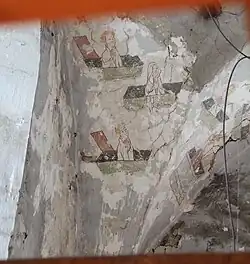 Der massiv aufgemauerte, spätromanische Chorturm auf quadratischem Grundriss ist ungegliedert und gegenüber dem Kirchenschiff eingezogen. Er stammt vermutlich aus dem Anfang des 13. Jahrhunderts.[3] Die kreuzgratgewölbte Halle im Erdgeschoss wird an den drei freistehenden Seiten von Spitzbogenfenstern belichtet. Unter dem nördlichen Fenster ist ein schlichtes hochrechteckiges Portal eingebrochen. Die beiden wehrhaften Obergeschosse haben horizontale und vertikale Schießscharten. Der hohe oktogonale, verschieferte Spitzhelm aus der Zeit des Kirchenneubaus entwickelt sich aus vier Dreiecksgiebeln.[1] Weil die Handwerker zu frisches Bauholz verwendet hatten, war der Helm von Anfang an geneigt. Er wird von einem Turmknauf, einem verzierten Kreuz und Wetterhahn bekrönt. An der Ostseite sind einige Grabsteine des 17. bis 19. Jahrhunderts aufgestellt. Im Inneren wurde der ursprüngliche Zugang zum Chorturm vermauert. Das Gewölbe weist Reste spätgotischer Malereien aus dem Anfang des 15. Jahrhunderts auf, die durch eine moderne Decke verdeckt werden. Dargestellt werden das Jüngste Gericht und an der Ostseite die Kreuzigungsszene. In der Ostwand des Turmes ist eine Piscina aus vorreformatorischer Zeit erhalten.[1]