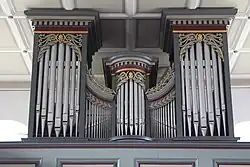 Die heutige Orgel baute Walcker 1953 mit 13 Registern, die sich auf zwei Manuale und Pedal verteilen. Der barocke Prospekt hat einen niedrigen Rundturm, der von zwei Flachfeldern flankiert wird. Diese schmiegen sich an die äußeren beiden hochrechteckigen Felder an, die bis an die Decke reichen. Die Disposition lautet wie folgt:[17]
