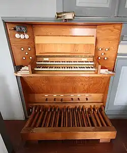 - ↑ a b c Die drei Pedalregister werden durch sehr schwergängigen Fußrasten ein- und ausgeschaltet, die sich auf der rechten Seite oberhalb des Pedals befinden.