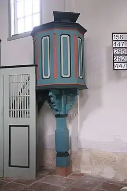 Der Innenraum wird durch eine Flachdecke abgeschlossen. An den beiden Ostseiten ist eine Winkelempore eingebaut, die auf Holzpfosten mit Bügen ruht. Die Empore im Chor dient als Aufstellungsort für die Orgel und kragt trapezförmig leicht nach vorne. Die Füllungen der kassierten Brüstung tragen Malereien aus der Zeit um 1780, die elf Apostel mit ihren Attributen, Christus als Salvator mundi, den Sündenfall, die Kreuzigungsgruppe und Johannes den Täufer mit sechs Fingern zeigen. Die schlichten Darstellungen im bäuerlichen Stil sind wenig plastisch und nicht proportional; als Vorlage haben wahrscheinlich die Malereien in der Kirche von Bellnhausen gedient.[9] Die Schrifttafel über dem Altar trägt den Bibelvers aus Offb 1,8 und die Tafel in der Mitte der Langseite das Jesuswort aus Joh 6,69 . Eine Tafel ist mit einem Blumengebinde bemalt.