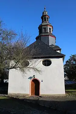 Der nicht geostete, sondern nach Nordost ausgerichtete Saalbau aus weiß verputztem Bruchsteinmauerwerk ist im alten Ortszentrum an einem sanft ansteigenden Hang oberhalb der Lahn errichtet.[1] Er steht inmitten eines Kirchhofs, der von einer bis zu 5 Meter hohen Mauer eingefriedet wird.[7] Das große Mauertor im Westen und das kleinere im Norden, das mit der Jahreszahl 1707 bezeichnet ist, korrespondieren mit den beiden Kirchenportalen. Das barocke Langhaus von 1701 wird von einem verschieferten Walmdach bedeckt, dem an jeder Seite zwei kleine Gauben aufgesetzt sind. Ein mittiges rundbogiges Westportal und ein hochrechteckiges Nordportal (nahe am Turm) erschließen das Gotteshaus. Über dem Nordportal ist der Türsturz mit der Jahreszahl 1700, dem Baubeginn des Kirchenschiffs, bezeichnet.[7] Das Innere wird an den beiden Langseiten durch je drei hohe Rundbogenfenster belichtet. An der Westseite sind unterhalb der Traufe zwei Ochsenaugen eingelassen. Der Dachfirst reicht an die Dachtraufe des Turms heran.
