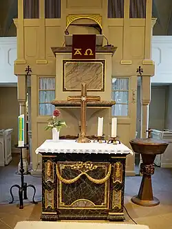 In typisch protestantischer Tradition sind die Prinzipalien Altar, Kanzel und Orgel hinter- und übereinander im Chorraum angeordnet. Das Ensemble geht auf das Jahr 1834 zurück. Der hölzerne, dunkelgrün marmorierte Blockaltar des 18. Jahrhunderts ist mit vergoldeten Girlandenschnitzereien verziert.[7] Dahinter ist die hölzerne Sakristei mittig eingebaut und an der Vorderseite die rechteckige Kanzel mit einer marmoriert bemalten querrechteckigen Füllung über einer Konsole angebracht. Der Rundbogen über der Kanzel ist mit vergoldeten Strahlenornamenten verziert. Über der Sakristei erhebt sich in derselben Breite die Orgel, deren Unterbau Lamellenöffnungen seitlich der Kanzel aufweist.[1] Der Zugang zu Kanzel und Orgel ist von hinten über die Sakristei. Hinter dieser ist eine Empore eingebaut, die niedriger als die Empore im Schiff ist.