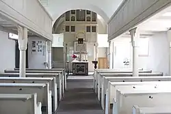 Der Innenraum wird von einer flachen Decke mit Unterzug abgeschlossen. Die Kirchenausstattung ist vorwiegend in Weiß mit teils vergoldeten Profilleisten gehalten. In das Langhaus ist eine dreiseitig umlaufende hölzerne Empore eingebaut, die auf Rundsäulen mit kubusförmigen Kapitellen und geschweiften Kopfbändern ruht. Die seitlichen Emporen im Chorraum wurden in den 1960er Jahren entfernt.[1] Über der Westempore ist ein hölzernes Wappen von Solms-Braunfels mit den Initialen FWSB (Fürst Wilhelm zu Solms-Braunfels) angebracht.