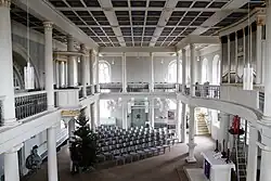 Der Innenraum ist 25,26 Meter lang und 13,25 Meter, im Bereich des Risalits 16 Meter breit. Er wird von einer flachen Kassettendecke abgeschlossen, die mit 666 vergoldeten Sternen auf blauem Untergrund ausgemalt ist. Jede Kassette umfasst neun achtzackige Sterne, die wahrscheinlich mit einer Schablone gezeichnet wurden. Die dezent integrierten Eisernen Kreuze im Zentrum der Sterne wurden später übermalt und sind nur oberhalb der Orgel erhalten.[11] Der Fußboden ist mit roten Sandsteinplatten belegt. Die Kirchenausstattung stammt überwiegend aus den 1830er Jahren. Ihre weiße Farbe mit Vergoldungen verleiht dem Raum eine vornehme Wirkung. Durch die vierseitig umlaufende Empore ist der großzügige Innenraum zweigeschossig gestaltet. Sie ruht auf 20 toskanischen Säulen, die oberhalb der Empore in 18 kannelierte korinthische Holzsäulen übergehen und die Unterzüge tragen.[12] Zwei Säulen fehlen dort, wo die Orgel aufgestellt ist. Die Empore springt an dieser Stelle, einer Apsis vergleichbar, konkav zurück und betont den Altarbereich.[18]