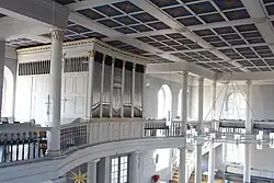 Der Kanzel, die hoch in die Westempore einbezogen ist, stehen an der Ostseite Altar und Orgel auf der Mittelachse gegenüber. Die halbkreisförmige Kanzel hat fünf schlichte Füllungen über einem reich verzierten Fries mit vergoldeten Voluten, Muscheln und Akanthusblättern. Der Schalldeckel ruht auf zwei runden und zwei viereckigen Säulen korinthischer Ordnung und ist mit einem Kranz aus vergoldeten Blättern verziert. An seiner Unterseite ist eine vergoldete Taube, Symbol für den Heiligen Geist, angebracht. Ein die Taube umgebender Strahlenkranz wurde später übermalt. Der konkave Orgelprospekt wird durch Pilaster in fünf Felder gegliedert. Unterhalb der Orgel steht der Blockaltar mit schwarzer Marmorplatte um zwei Stufen erhöht. Das Altarkreuz und die beiden Leuchter sind aus Gusseisen gefertigt und stammen vermutlich von 1830.[19]