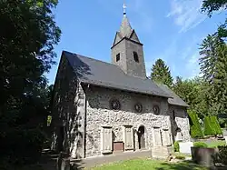 Die Maße des Langhauses basieren auf dem römischen Fuß, was eine Erbauungszeit vor dem 13. Jahrhundert nahelegt.[10] Das Langhaus ist genau 37 römische Fuß lang und 27 römische Fuß breit.[3] Es wird durch Portale an der West- und Südseite erschlossen. Das unregelmäßige Gewände des Südportals geht auf wiederverwendete Teile eines breiteren romanischen Portals zurück. Drei kleine Rundfenster an der Südseite und zwei große Rundbogenfenster an der Nordseite von 1950 belichten den Innenraum. Statt des Emporenzugangs an der Südseite wurde in den 1960er Jahren ein Rundfenster eingelassen.[7] Dem Satteldach ist ein Dachreiter aufgesetzt. Der hohe, verschieferte, quadratische Schaft hat an jeder Seite sehr kleine Schalllöcher für das Geläut. Vier Dreiecksgiebel leiten zu dem vierseitigen Spitzhelm über, der von Turmknauf und Wetterhahn bekrönt wird. Der Dachreiter beherbergt ein Vierergeläut. Die älteste Glocke datiert von 1770. Sie wurde von Freiherr Johann Jacob von Zwierlein gestiftet und von Johann Philip Henschel in Gießen gegossen.[11]