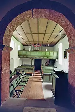 Der Innenraum wird von einer Flachdecke abgeschlossen, die nach dem Wiederaufbau ohne Mittelstützen ist. Ältestes Ausstattungsstück ist ein romanisches Taufbecken aus Lungstein (Durchmesser außen 0,87 Meter, Höhe 0,62 Meter) mit einem verzierten Rundbogenfries unter einem Tauband.[12]