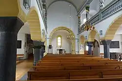Die Vorgängerkirche wurde um 1200 als dreischiffige Basilika erbaut, von ihr sind der romanische Chorturm und der südliche Nebenchor sowie das Fächerfenster der Westfassade erhalten. als 1557 1618 war zum Einbau einer Empore ein größerer Umbau nötig und Gewölbe sowie Dach wurden ersetzt. 1695 wurde das Langhaus verlängert und größere Fenster wurden eingesetzt. Zur Vergrößerung wurden dem Langhaus 1718 Querschiffarme angesetzt. Die Kirche ist im Lichten 22 Meter lang und im Schiff 10,70 Meter breit. Bei einer Renovierung 1879 bekam der Turm ein Rautendach und die Giebel.[2] Die letzte größere Innenrenovierung fand 2000 statt.