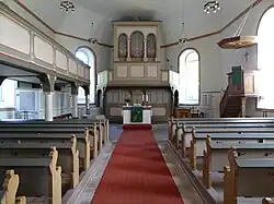 Der Innenraum wird von einer Muldendecke mit Kehle abgeschlossen. Unter dem umlaufenden Holzgesims ist ein bunter Fries aufgemalt, der aus Kostengründen nur auf einem etwa einen Meter langen Abschnitt freigelegt wurde. An der West- und Nordseite ist eine Winkelempore eingebaut, die auf runden Holzsäulen mit hohen quadratischen Basen und langen quadratischen Kapitellen ruht. Die kleinen Bügen werden durch einfaches Schnitzwerk verziert. Die kassettierten Füllungen der Brüstung werden durch aufgelegte durchbrochene Laubsägeornamente mit Obelisken gegliedert.[15] Die Orgel ist auf einer trapezförmig vorspringenden Ostempore von 1863 mit Stützen aus dem 18. Jahrhundert aufgestellt. Das Kirchengestühl von 1754 mit den alten, profilierten, geschwungenen Wangen lässt einen Mittelgang frei.[16]
