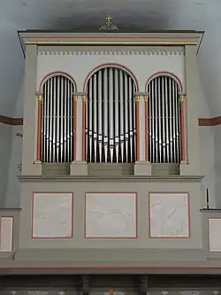 Die neue Kirche blieb mehr als 20 Jahre ohne Orgel. Die Gemeinde bat die Gießener Universität im Jahr 1775 darum, ihr die Orgel der Gießener Burgkirche zu überlassen. Nach Errichtung der Orgelempore im Jahr 1778 wurde die erbetene Orgel, die 1654 ein unbekannter Orgelbauer mit fünf Registern gebaut hatte, aufgestellt. Karl Rudolf Bernhard aus Romrod schuf 1863 ein neues Instrument mit zwei Kastenbälgen und zehn Registern, die auf einem Manual und Pedal verteilt waren. Die Einweihung erfolgte am 1. Oktober 1864. 1879 führte Johann Georg Förster eine Reparatur durch. Für die 1917 abgelieferten zinnenen Prospektpfeifen wurden später als Ersatz Zinkpfeifen eingebaut. Im Zuge einer Renovierung durch Förster & Nicolaus Orgelbau im Jahr 1951 wurde die Disposition geändert.[19] 1971 folgte der Einbau eines elektrischen Gebläses, 1993 eine weitere Änderung der Disposition und der Wiedereinbau von Zinnpfeifen in den Prospekt. Zum 150-jährigen Orgeljubiläum erhielt die Orgel 2014 einen neuen Motor. Der Prospekt wird durch Pilaster in drei rundbogige Pfeifenfelder gegliedert. Die Disposition lautet seit 1993 wie folgt: