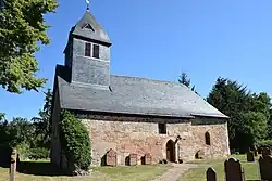 Die kleine Kirche wird von einem verschieferten Satteldach bedeckt, das im Osten abgewalmt ist. Eine Windfahne im Osten ist mit der Jahreszahl 1728 bezeichnet und weist auf den Umbau des Chors hin, der zu dieser Zeit unter einem gemeinsamen Dachfirst mit dem Schiff vereint wurde. In der westlichen Südseite des Schiffs sind als Spolien ein hochsitzendes, monolithisches, abgerundetes Schlitzfenster und darunter ein großer romanischer Rechtecksturz vermauert, der auch als Grabplatte gedeutet worden ist.[8] Zusammen mit Mauerresten an der Südwestecke können sie auf einen ursprünglichen Anbau, womöglich einen Turm, hinweisen.[3]
