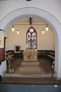 Im Inneren öffnet ein Rundbogen den etwas eingezogenen und um eine Stufe erhöhten Rechteckchor zum Schiff. Dem Dach ist im Westen ein vierseitiger, vollständig verschieferter, leicht geschwungener Dachreiter aufgesetzt,[1] der von einem vergoldeten Wetterhahn mit Turmknauf und verziertem Kreuz bekrönt wird. Der Schaft des Dachreiters hat im Süden und Norden zwei hochrechteckige Schallöffnungen und im Dach vier vorkragende dreieckige Öffnungen für das Geläut.