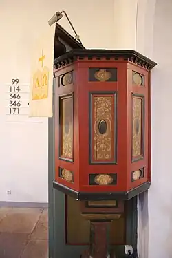 Ältestes Inventarstück der Kirchenausstattung ist ein romanisches Taufbecken, das vor der Südseite des Chorbogens aufgestellt ist.[3] An der Nordseite des Bogens ist die hölzerne Kanzel angebracht. Der polygonale Kanzelkorb mit hochrechteckigen Füllungen wird von einem viereckigen Fuß getragen, der nach einem Schwelbrand in den 1960er Jahren erneuert wurde. Zugänglich ist die Kanzel durch einen angeschlossenen Pfarrstuhl in der Nordostecke, der im unteren Bereich bemalte kassettierte Füllungen mit Rocaillen und im oberen Bereich durchbrochenes Rautenwerk aufweist und der als Sakristei dient.