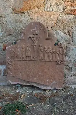 Westlich vom Portal sind drei barocke Grabsteine des 18. Jahrhunderts aus Rotsandstein und weiter östlich ein vierter aufgestellt.[1] Sie haben unter dem rundbogigen Abschluss bildliche Darstellungen. Zwei zeigen den Verstorbenen, der von Blumen als Zeichen der Vergänglichkeit flankiert wird, zwei stellen die Familie des Verstorbenen unter dem Kreuz dar. Das Schriftfeld wird von rahmenden Rocaillen verziert. Alle vier Grabsteine sind im Sockelbereich abgebrochen.