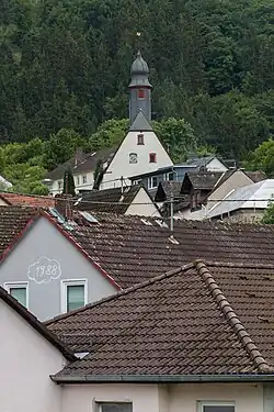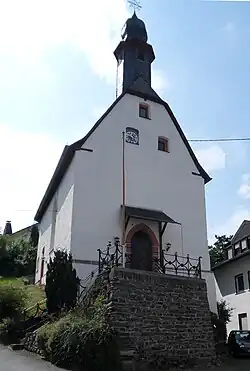 Der kleine Saalbau wurde um 1500 mit einem Chor mit Fünfachtelschluss errichtet, Bauherr war Engelbert von Nassau-Idstein, Domherr zu Mainz und Probst des Bartholomäusstiftes zu Frankfurt.[1][3] Graf Engelbert präsentierte 1506 den Priester Martin Sutorius als wohl ersten Priester der Kirche. 1512 wurde die erste Glocke mit der Inschrift Got furlei und ein selig stunt Anno MCCCCCXII aufgehängt, eine zweite Glocke wurde 1554 ergänzt.[4] Während des Dreißigjährigen Krieges wurde das Gebäude stark beschädigt, vermutlich wurden auch die Glocken gestohlen.[5] Der Haubendachreiter stammt von der zweiten Hälfte des 18. Jahrhunderts, um 1785 wurde das Gebäude renoviert.[6] Die zwei kleinen Bleiglasfenster wurden am Anfang des 16. Jahrhunderts eingebaut. Sie zeigen eine Wappendarstellung sowie eine Darstellung der Anna selbdritt.[2] Die Maßwerkfenster sind mit Fischblasen verziert. Über der ehemaligen Priesterpforte mit Überstabungen ist das Nassauer Wappen angebracht.[7] Ursprünglich war die ehemalige Burgkapelle dem hl. Valentin geweiht. In der Kirche steht ein Taufstein vom Ende des 15. Jahrhunderts, dessen Kuppa mit Blendmaßwerk verziert ist. Das Gestühl ist von 1680, die Kanzel ist mit 1692 bezeichnet und am Fuß mit geschnitzten Früchten verziert. Das ländliche Kruzifix stammt aus dem 18. Jahrhundert. Der Opferstock aus Stein ist wohl eine Arbeit vom Ende des 17. Jahrhunderts.[7] 1826 musste der Kirchturm erneuert werden, die Bauleitung hatte der Amtswerkmeister Rock von Laufenselden. 1875 wurden die vorhandenen Glocken durch zwei neue ersetzt. Eine neue Orgel baute 1893 die Firma Daniel Rassmann auf.[8]