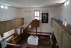 Der Innenraum wird von einer Flachdecke mit Voute abgeschlossen und ist gewestet. Der Boden ist seit 1841 mit Platten aus rotem Sandstein belegt. Die originale Kirchenausstattung ist weitgehend holzsichtig oder holzfarbig. Eine dreiseitig umlaufende Empore ruht auf runden Säulen und wird bis an die Westwand geführt. Die Ostempore über dem Portal dient als Aufstellungsort für die Orgel und trägt als Inschrift den Bibelvers „Seid fröhlich in Hoffnung / geduldig in Trübsal / haltet an am Gebet / Römer 12 / Vers 12“ und darunter den Friedensgruß „Friede sei mit euch!“ Beide Inschriften wurden vermutlich 1907 angebracht. Die Emporenbrüstungen haben schlichte, hochrechteckige profilierte Füllungen, über denen an den Langseiten innen und außen die Namen der Kirchgänger in Weiß gemalt sind. Das schlichte Kirchengestühl lässt einen Mittelgang frei. Auch auf den vorderen vier der jeweils sechs Bankreihen sind die Namen für die Platzinhaber aus der Bauzeit zu lesen.