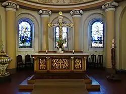Die Ausstattung der Kirche ist im Stil des Neoklassizismus.[1] Im Altarraum befindet sich eine mächtige goldene Darstellung des gekreuzigten Jesus. An der Spitze des Kreuzes ist Gott und an den Enden des Querholzes jeweils ein Engel dargestellt. Die farbigen Glasfenster im Altarraum stellen die Geburt, Himmelfahrt und Auferstehung Jesu dar. Die Säulenkapitelle sind mit Textzeilen aus dem Vaterunser und entsprechenden Bildern verziert.