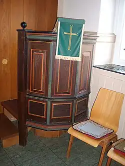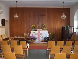 Der Gottesdienstsaal im mittleren Geschoss ist schlicht ausgestattet und hat hölzerne Einzelstühle. Auf einem Podest steht ein Altartisch vor einer holzverkleideten Wand, an der mittig ein einfaches Holzkreuz angebracht ist. Ältestes Inventarstück ist die Kanzel, die aus der alten Kirche übernommen wurde. Von ihr ist noch der polygonale Kanzelkorb erhalten, der in zwei Ebenen kassettierte Füllungen aufweist. Eine Elektronenorgel dient zur Begleitung des Gemeindegesangs. Die ehemalige Lehrerwohnung im Obergeschoss wird ebenfalls für gemeindliche Zwecke genutzt.