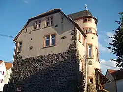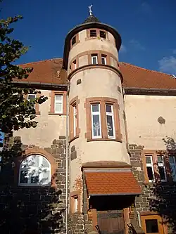 Die Südseite wird durch den halbrunden Treppen- und Glockenturm geprägt, der mittig in das Gebäude eingebunden ist. Nur im untersten Bereich weist er Basalt auf und ist ansonsten verputzt. Eine Treppe aus rotem Sandstein führt zur eisenbeschlagenen rechteckigen Eingangstür unter einem Vordach. Der Treppenturm wird in der Mitte von einem Rechteckfenster nach Osten, einem Zwillingsfenster nach Süden und einem weiteren Rechteckfenster nach Westen belichtet, die mit dem Treppenverlauf ansteigen. Über dem Gesims in Traufhöhe des Walmdachs sind nach den drei Seiten drei kleine rechteckige Zwillingsfenster unter einem umlaufenden Sandsteinband eingelassen, darüber die rechteckigen Schalllöcher der Glockenstube. Der Turm beherbergt zwei kleine Glocken der Firma Rincker, eine kleine schlichte Glocke mit der Inschrift „A.D. 1972“ und eine größere mit Blumenfries und der Inschrift „Gott allein die Ehre“. Das Satteldach wird von einem Wetterhahn bekrönt. Es erreicht dieselbe Höhe wie das Walmdach und wird an dieses angeschlossen. Die östliche Südseite hat im Untergeschoss mit den Kellerräumen kleine quadratische Fenster unter einem profilierten Sandsteingesims und eine schlichte rechteckige Tür, im mittleren Geschoss sechs rechteckige Fenster. An der Außenwand sind drei barocke Grabsteine des 18. Jahrhunderts[1] aufgestellt. Die westliche Südseite hat in der Mitte ein breites dreiteiliges Rundbogenfenster und unter der Traufe zwei kleine Rechteckfenster.