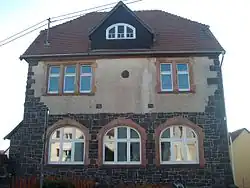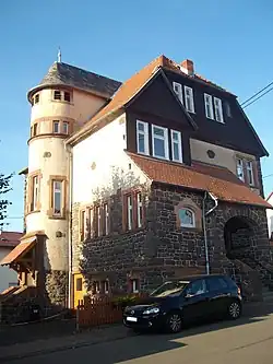 Der zweigeschossige Bau mit Kellergeschoss in Hanglage ist im Dorfzentrum errichtet. Das Walmdach hat an der Nordseite einen Zwerchgiebel. Verschiedenartige Baumaterialien kommen in dem komplexen Gebäude zum Einsatz.[1] Die Sockel und das untere Geschoss sind aus rustizierendem Bruchsteinmauerwerk aus Basalt aufgemauert. Alle Fenster haben Umrahmungen aus rotem Sandstein. Das Obergeschoss ist verputzt und hat unregelmäßige Eckquaderung und vereinzelt hervortretende Basaltsteine. Die Giebel sind verschiefert.