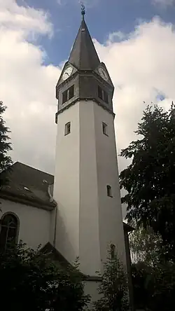 Der 37 Meter hohe Kirchturm an der Nordseite besteht aus dem gemauerten unteren Teil und dem verschieferten, hölzernen Turmaufbau. Der Turm schloss ursprünglich mit einer verschieferten welschen Haube über einer Laterne ab.[9] Das kubusförmige Glockengeschoss beherbergt drei Bronzeglocken der Firma Rincker, eine kleine von 1921 und zwei größere von 1951. Vier Dreiecksgiebel leiten zum oktogonalen Spitzhelm über, der von einer Bronzekugel, einer schmiedeeisernen Rosette mit einem umrankten Kreuz und einem vergoldeten Wetterhahn mit einem Stern bekrönt wird.[10]