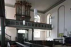 An der Westwand befindet sich die 1637 gebaute Orgel, die 1783/1784 gebraucht von der Frankfurter Dreikönigskirche erworben wurde.[15] Das Instrument war ursprünglich wahrscheinlich einmanualig und hatte seitliche Flügeltüren; die Stellen für die Scharniervorrichtungen sind noch erkennbar.[16] Johannes Peter Rühl stellte die Orgel in der Atzbacher Kirche auf und veränderte nach eigener Aussage auf einer Gehäuseinschrift die Disposition: „Von mir aber dorten abgebrochen und hier wieder aufgestellt und vieles daran neu gemacht als ein Manual und Pedalklavier, wie auch ein Violi de Gamba und noch etlich hölzerne Pfeifen. Auch habe ich 2 Sch und 5 Zoll von der Höhe abgenommen.“[17] Das Instrument wurde danach noch mehrfach repariert und umgebaut. Im Jahr 1842 führte Orgelbauer Loos aus Siegen eine Reparatur durch, 1886 schlug Johann Georg Förster einen Neubau vor (I/P/11). Die Prospektpfeifen aus Zinn wurden 1917 an die Rüstungsindustrie abgeliefert und durch silberbemalte Holzattrappen ersetzt. Um 1935 erfolgte der Einbau eines elektrischen Gebläses. Bei einer Renovierung durch Orgelbau Hardt aus Möttau wurden die Holz- durch Zinkpfeifen ersetzt. 1997/1998 restaurierte Förster & Nicolaus die Orgel und führte sie auf den Stand der Kirchenweihung zurück. In diesem Zuge wurden florale Malereien am Gehäuse freigelegt, der auf dem Dachboden der Kirche gelagerte Windbalg wieder eingebaut und die ursprüngliche Disposition wiederhergestellt.[10] Die Orgel verfügt heute über zwölf Register mit insgesamt 1020 Pfeifen. Fünf Register wurden rekonstruiert, sieben historische Register sind erhalten. Im fünfteiligen Prospekt wird der überhöhte mittlere Rundturm von je zwei gleich hohen Flachfeldern flankiert, über denen zwei Posaune blasende Engel angebracht sind. Der Mittelturm wird von einem gekrönten Adler, dem Wappen der Stadt Frankfurt, bekrönt.[18]