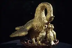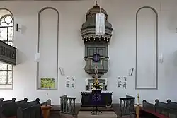 Über dem Altar befindet sich die gebauchte Kanzel mit großem Schalldeckel, der mit vergoldeten Quasten verziert ist. Auf seiner Spitze thront ein Pelikan, der mit seinem Blut seine Jungen nährt, ein Symbol für Christus, der sich für seine Gemeinde opfert.[10] Die Kanzel ist von hinten über eine Treppe im Turm zugänglich. Die Kanzelfelder des achteckigen Kanzelkorbes werden durch Zierprofile gegliedert.[11]