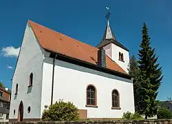 Nördlich des Chores befindet sich eine kleine Sakristei. Von dem Vorgängerbau ist außerdem ein gotisches Fenster im Chor erhalten. Im Westen befindet sich ein gotisches Spitzbogenportal mit profilierter Sandsteinlaibung. Die Konsolsteine sind figürlich ausgebildet, auf dem Bogenfeld prangt eine heraldische Rose. Flankiert wird es durch zwei Rundfenster. Chorraum und Schiff werden durch ein Barockportal getrennt. Die Kirche wird von zwei Fensterachsen mit Rundbogenfenstern auf den Langseiten belichtet.