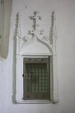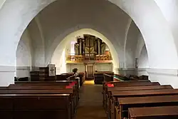 Das einjochige Schiff und der aus einem eingezogenen, quadratischen Joch bestehende Chor sind mit kuppeligen Kreuzgratgewölben ausgestattet. Der Westturm wird von einem Zeltdach bedeckt.