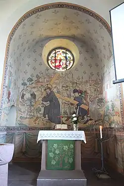Die polychromen Einzelszenen der spätgotischen Fresken werden durch viereckige, friesartige Rankenbänder umrahmt, die auf schwarzem Hintergrund einen weißen Stab mit weißen Blättern und sechsblättrigen roten Blüten hat.[10] An der original erhaltenen Nordwand sind als Malereien die Verkündigung des Herrn, Christi Geburt, die Anbetung der Heiligen Drei Könige vor dem Stall in Bethlehem und Christophorus mit dem hl. Antonius und der Ballersbacher Mühle dargestellt. Die vier Szenen aus der Schöpfungsgeschichte, die ursprünglich darüber angebracht waren und nun an der Ostwand zu sehen sind, zeigen die Erschaffung von Adam und Eva, den Sündenfall, die Vertreibung aus dem Paradies und die Darstellung von Adam mit dem Spaten bei der Feldarbeit Eva beim Wolle Spinnen. Von der Südwand auf den Westchor wurden die figurenreiche Kreuztragung und Kreuzaufrichtung mit der Verspottung Jesu übertragen.[11]