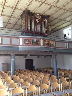 Die Kirche ist mit dem Turmchor nach Osten ausgerichtet. Im Westen des Langhauses ist eine einstöckige Empore eingezogen. Im Inneren der Kirche haben sich viele der historischen Ausstattungsteile erhalten, darunter eine schmuckvolle bemalte Kanzel mit Schalldeckel rechts vom Chorbogen sowie die Empore mit teilweise bemalten Brüstungsfeldern und der historischen Kirchenorgel. In der Kirche sind außerdem verschiedene Grabmale von Pfarrern und Pfarrersfrauen aufgestellt, darunter das besonders schmuckvolle Grabmal der 1709 im Kindbett gestorbenen Sabrina Dederer links vom Chorbogen.