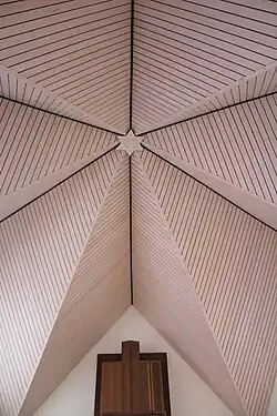 Dem Faltdach der Kirche entspricht im Inneren eine Faltdecke. Der Boden ist mit Steinplatten aus Grauschiefer belegt.[12] An der südlichen Seite des Chorbogens ist die viereckige Kanzel mit entsprechendem Schalldeckel angebracht. Das quadratische Bildrelief mit rundem Motiv an der Vorderseite der Kanzel zum Thema Schöpfung und Neuschöpfung gestaltete die Künstlerin Gertrude Reum. Ein Ehepaar stiftete es 2009 der Gemeinde. Über dem westlichen Eingang der ansonsten emporenlosen Kirche ist eine kleine Orgelempore eingebaut. Das schlichte hölzerne Kirchengestühl bildet einen Mittelblock.