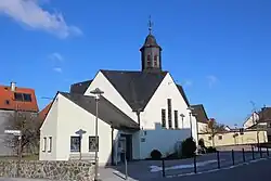Der sechseckige Gemeindesaal von 1966/1967 geht auf den Entwurf des Architekten Rohrbach zurück. Der zentralisierende Bau wird durch vier Dreiecksgiebel beherrscht, die in ein Faltdach übergehen. In jede Giebelseite ist ein schmales Drillingsfenster mit Bleiglasfenstern eingelassen, dessen mittleres Fenster überhöht ist. Der Westgiebel hat einen schmalen eingezogenen Vorbau in Trapezform, der als Eingangsbereich und Sakristei dient. Der Vorbau wird von einem Satteldach bedeckt, durch ein Südportal erschlossen und im Westen durch vier viereckige Bleiglasfenster mit Licht versorgt.