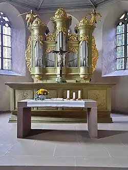 Im hinteren Teil der Kirche befindet sich eine Empore. Die Orgel steht im Chor hinter dem Altar. Es handelt sich um ein Instrument im barocken Gehäuse, das der Orgelbauer Georg Marcus Stein, ein Schüler von Johann Andreas Silbermann, als eines seiner letzten Werke 1791 gebaut hatte. Die Orgel hat zwölf Register auf einem Manual und Pedal.[3]